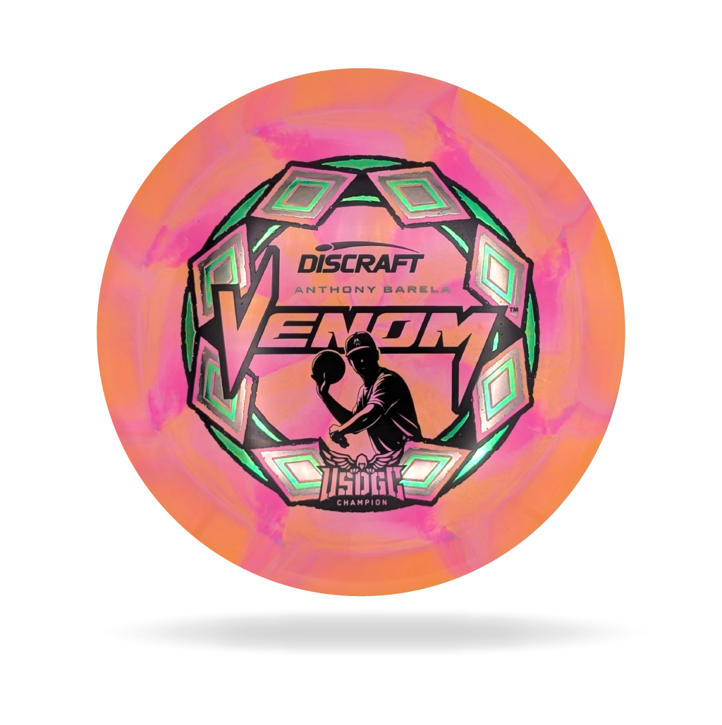 A max-speed, overstable distance driver built for big arms, the Venom shrugs off torque and headwinds, tracking each line before a hard, late fade that bites down fairways and skips into position. The refined rim feels fast yet secure, rewarding full-power backhands and confident forehands with predictable overstability and plenty of finish. Tuned to echo the beloved Test Flight Venom, this run pairs tour-level grip with eye-catching swirls and the durability big arms demand.