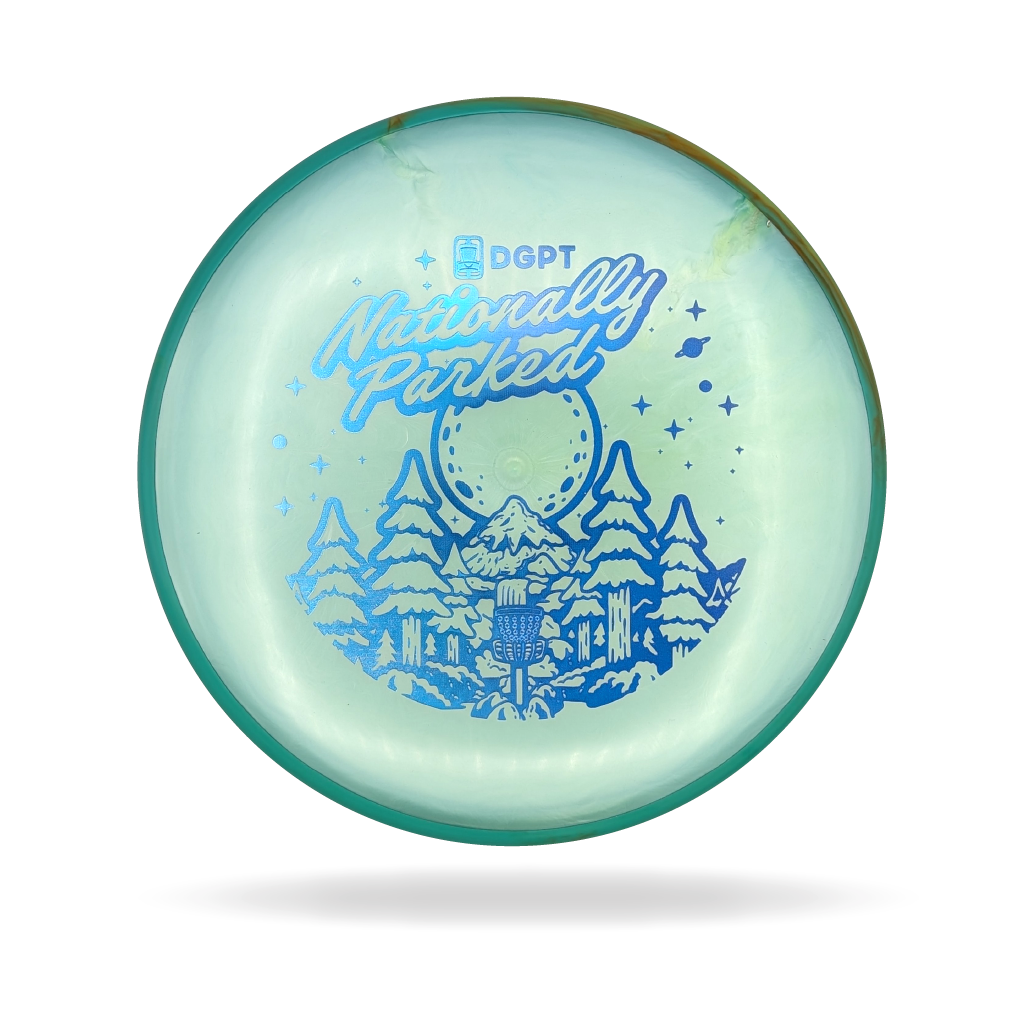 Experience the majesty of America’s great outdoors with the 2025 Nationally Parked DGPT design. This year’s edition features a stunning waterfall cascading from rugged mountain peaks, capturing the serene power and beauty of our national parks. Every detail—from the mist rising off the falls to the towering mountain ridges—evokes the feeling of being immersed in nature’s grandeur. Perfect for collectors and disc golf enthusiasts alike, this design celebrates adventure, exploration, and the landscapes that inspire the game.